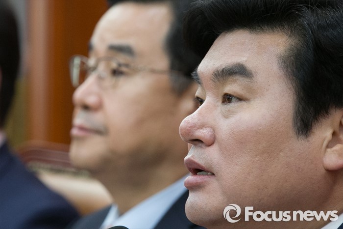 (서울=포커스뉴스) 원유철(오른쪽) 새누리당 대표최고위원 권한대행이 29일 오전 서울 여의도 국회에서 열린 원내대책회의에 참석해, 모두발언하고 있다.