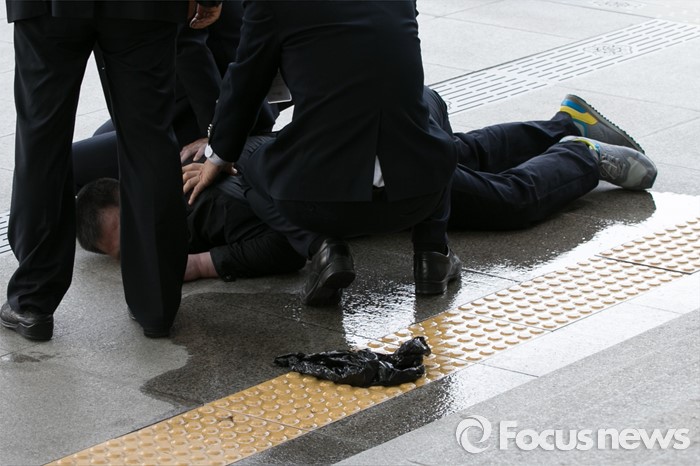 경찰 관계자는 "병원에서 남성의 상태를 진단하는 중"이라며 "진단 및 치료가 완료 되는대로 입건여부를 결정할 방침"이라고 말했다.(서울=포커스뉴스) 25일 오후 서울 여의도 국회 의원회관 앞에서 신원 미상의 한 중년 남성이 분신 시도를 하려다, 국회 방호원들에게 제압당하고 있다. 2016.04.25 박철중 기자