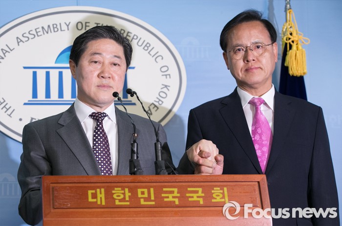 앞서 한 의원은 친박계 유기준, 홍문종 의원의 원내대표 후보 단일화 논란이 일자, "새누리당 원내대표 경선을 놓고 스스로 친박 후보임을 자처한 두 명이 만나, 한 분(유기준 의원)은 원내대표 , 한 분(홍문종 의원)은 전대후보로 나눠먹기 합의를 했다고 하니 이 무슨 경을 칠 일인가"라며 강하게 성토한 바 있다.(서울=포커스뉴스) 유기준(왼쪽) 새누리당 의원이 28일 오후 서울 여의도 국회 정론관에서 원내대표 출마 기자회견을 하며 정책위의장 러닝메이트 후보인 이명수 의원과 손을 잡고 있다. 2016.04.28 박동욱 기자