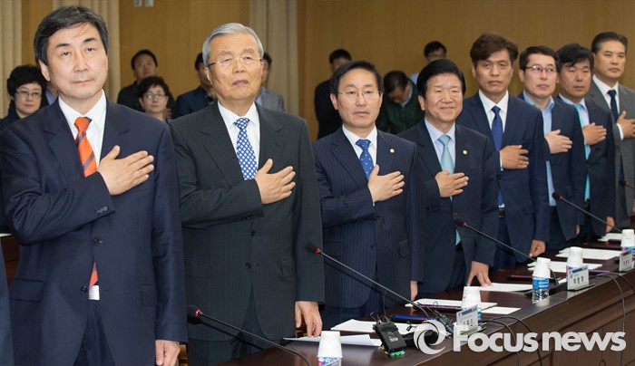 (대전=포커스뉴스) 김종인 더불어민주당 비대위 대표와 이종걸 원내대표를 비롯한 더민주 의원 및 당직자들이 28일 오후 대전시청을 방문한 가운데 대회의실에서 열린 더불어민주당-대전시 정책간담회에서 김종인 대표가 국기에 대한 경례를 하고 있다.