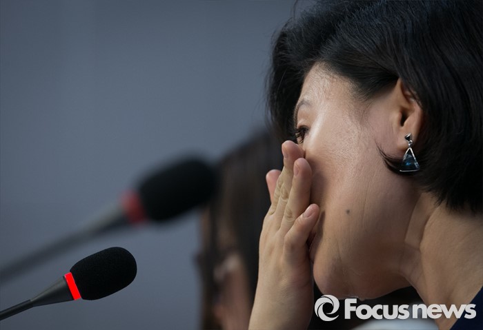 (서울=포커스뉴스) 26일 오후 서울 여의도 국회 의원회관에서 북한자유주간 주최, 통일맘연합 주관으로 열린 중국과 제3국에서 자녀와 헤어진 탈북여성들의 호소, '내 아이를 안고 싶어요' 증언대회에 참석한 북한 여군 장교 출신 탈북 방송인 김정아 씨가 발언 중 눈물을 흘리고 있다.