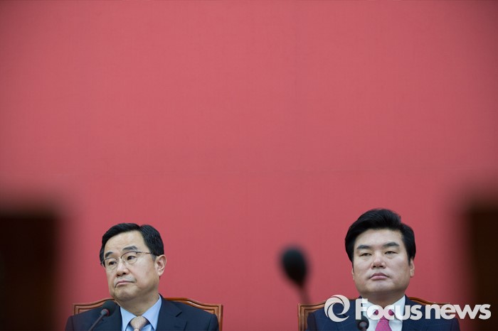 (서울=포커스뉴스) 원유철(오른쪽) 새누리당 대표최고위원 권한대행과 김정훈 정책위의장이 2일 오전 서울 여의도 국회에서 열린 마지막 원내대책회의에 참석하고 있다.