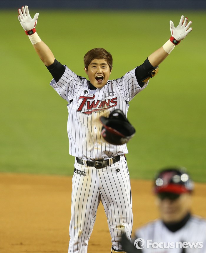 (서울=포커스뉴스) 29일 서울 잠실구장에서 열린 2016 프로야구 kt-LG 경기 9회말 1사 만루에서 LG 채은성이 끝내기 우전안타를 치고 1루에서 환호하고 있다.