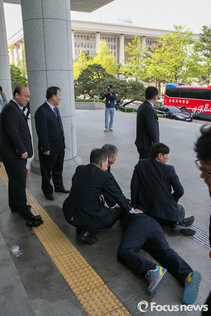 (서울=포커스뉴스) 25일 오후 서울 여의도 국회 의원회관 앞에서 신원 미상의 한 중년 남성이 분신 시도를 하려다, 국회 방호원들에게 제압당하고 있다.