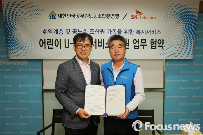 (서울=포커스뉴스) 대한민국공무원노동조합총연맹(위원장 류영록)이 2일 서울 용산구 공노총 회의실에서 SK텔레콤과 ‘어린이 U-안심서비스 지원 MOU'를 체결 맺고 기념촬영을 하고 있다. <사진제공=대한민국공무원노동조합총연맹>