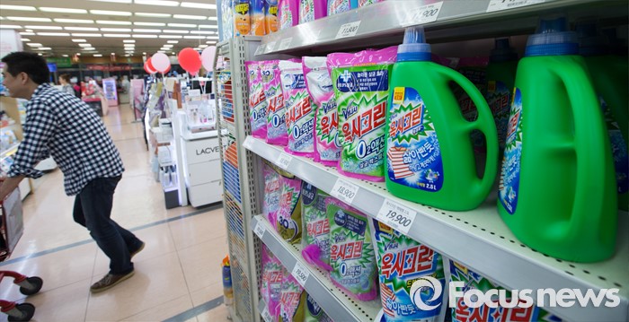 (서울=포커스뉴스) 3일 오전 서울 시내 한 마트에 옥시레킷벤키저 제품들이 진열되어 있다. 지난 2일 아타울라시드 사프달 옥시 대표가 가습기살균제 사건 관련 사과 했지만 피해자 가족과 단체들은 옥시의 사과를 거부하며 1인 시위, 고발장 접수 등 거세게 반발했다.