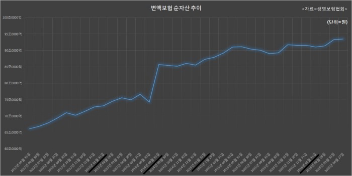 3일 생명보험협회에 따르면 올해 4월 27일 기준 변액보험 순자산액은 93조4918억원으로 변액보험 사태가 터진 직후인 2012년 4월말(67조3796억원)과 비교할 때 4년 새 38%(26조1122억원)나 증가했다.