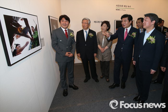 (서울=포커스뉴스) 3일 오전 서울 강남구 코엑스에서 열린 '52회 한국보도사진전 개막식'에 참석한 안철수(오른쪽부터) 국민의당 상임공동대표, 원유철 새누리당 원내대표, 심상정 정의당 상임대표가 이동희(왼쪽 첫번째) 사진기자협회장의 안내를 받으며 전시된 사진을 관람하고 있다. '찰나의 기록, 시대의 진실'을 주제로 진행된 이번 전시는 시대의 진실을 기록한다는 사명감으로 역사의 현장을 묵묵히 지키며 취재한 수백만 컷 중 선정된 150여점과 '현장의 사진기자', '역대 대상 수상작' 등 250여점의 사진이 전시된다.