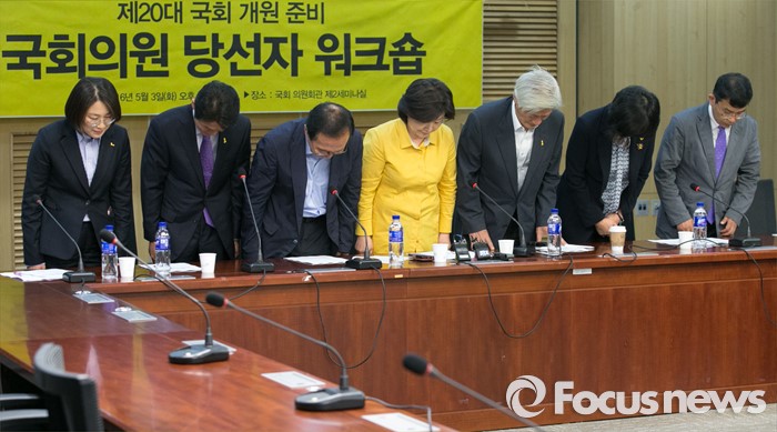 (서울=포커스뉴스) 심상정 정의당 상임대표와 김세균 공동대표가 3일 오후 서울 여의도 국회 의원회관에서 열린 20대 총선 당선자 워크숍에 참석해 당선인들과 함께 인사하고 있다. 왼쪽부터 추혜선, 윤소하 비례대표 당선인, 노회찬 당선인, 심 대표, 김 대표, 이정미, 김종대 비례대표 당선인.