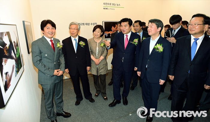 (서울=포커스뉴스) 3일 오전 서울 강남구 코엑스에서 열린 '52회 한국보도사진전 개막식'에 참석한 김부겸(오른쪽부터) 더불어민주당 당선인, 안철수 국민의당 상임공동대표, 원유철 새누리당 대표최고위원 권한대행, 심상정 정의당 상임대표 등 인사들이 이동희 한국사진기자협회장의 안내를 받으며 전시된 사진을 관람하고 있다. '찰나의 기록, 시대의 진실'을 주제로 진행된 이번 전시는 시대의 진실을 기록한다는 사명감으로 역사의 현장을 묵묵히 지키며 취재한 수백만 컷 중 선정된 150여점과 '현장의 사진기자', '역대 대상 수상작' 등 250여점의 사진이 전시된다.