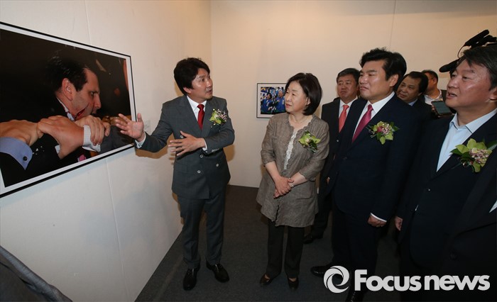 (서울=포커스뉴스) 3일 오전 서울 강남구 코엑스에서 열린 '52회 한국보도사진전 개막식'에 참석한 안철수(오른쪽부터) 국민의당 상임공동대표, 원유철 새누리당 원내대표, 심상정 정의당 상임대표가 이동희 사진기자협회장의 안내를 받으며 전시된 사진을 감상하고 있다. '찰나의 기록, 시대의 진실'을 주제로 진행된 이번 전시는 시대의 진실을 기록한다는 사명감으로 역사의 현장을 묵묵히 지키며 취재한 수백만 컷 중 선정된 150여점과 '현장의 사진기자', '역대 대상 수상작' 등 250여점의 사진이 전시된다.