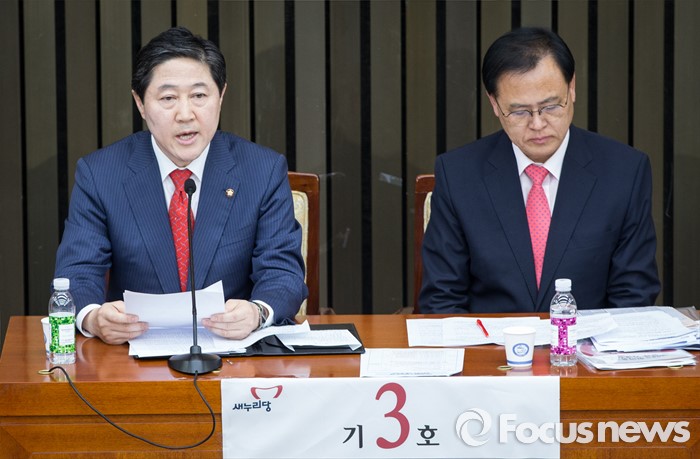(서울=포커스뉴스) 유기준(왼쪽) 새누리당 원내대표 후보자와 이명수 정책위의장 후보자가 3일 오후 서울 여의도 국회에서 열린 새누리당 원내대표, 정책위의장 선출 및 당선자 총회에 참석하고 있다.