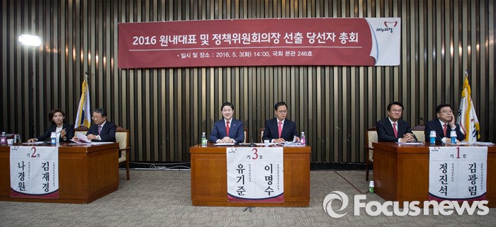 (서울=포커스뉴스) 정진석, 나경원, 유기준 원내대표 후보자 및 정책위의장 후보자들이 3일 오후 서울 여의도 국회에서 열린 새누리당 원내대표, 정책위의장 선출 및 당선자 총회에 참석하고 있다. 왼쪽부터 나경원 원내대표 후보자, 김재경 정책위의장 후보자, 유기준 원내대표 후보자, 이명수 정책위의장 후보자, 정진석 원내대표 후보자, 김광림 정책위의장 후보자