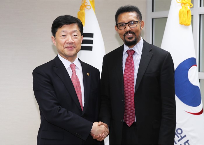 (서울=포커스뉴스) 우태희(왼쪽) 산업통상자원부 2차관이 3일 오후 서울 종로구 정부서울청사 집무실에서 아케베 오쿠바이 메티쿠(ARKEBE Oqubay Metiku) 에티오피아 총리 특별보좌관(장관급)의 예방을 받고, 면담에 앞서 기념촬영 하고 있다. <사진제공=산업통상자원부>