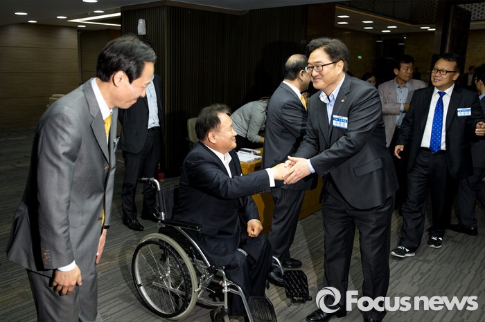 (서울=포커스뉴스) 더불어민주당 원내대표 경선에 출마한 우상호(왼쪽) 의원과 이상민(왼쪽 두 번째) 의원, 강창일 의원이 3일 오후 20대 국회의원 당선자 및 당무위원 연석회의가 개최된 서울 여의도 국회 예결위회의장 앞에서 당원들에게 한 표를 호소 하고 있다.