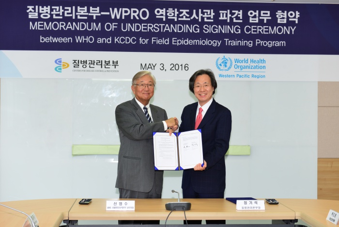 (청주=포커스뉴스) 정기석(오른쪽) 질병관리본부장이 3일 충북 청주 질병관리본부에서 신영수 세계보건기구(WHO) 서태평양지역 사무처(WPRO) 사무처장과 인적 교류 등을 위한 업무 협약을 하고 있다. <사젠제공=질병관리본부>