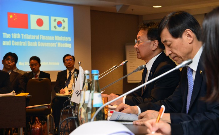 (서울=포커스뉴스) ADB연차 총회 참석차 독일 프랑크푸르트를 방문 중인 유일호 부총리 겸 기획재정부 장관이 3일(현지시간) 메리어트호텔에서 열린 제16차 한·중·일 재무장관회의에 참석해, 회의를 하고 있다. <사진제공=기획재정부>