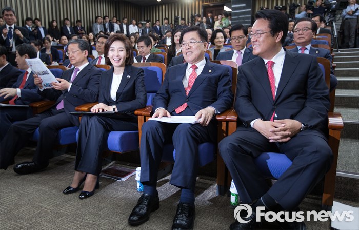 (서울=포커스뉴스) 나경원(가운데) 새누리당 원내대표 후보자가 3일 오후 서울 여의도 국회에서 열린 새누리당 원내대표, 정책위의장 선출 및 당선자 총회에 참석해 정진석(오른쪽) 원내대표 후보와 대화하며 웃고 있다.