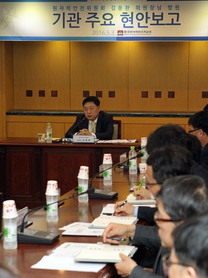 (대전=포커스뉴스) 김용환 원자력안전위원회 위원장이 3일 대전에 위치한 한국원자력안전기술원을 방문해 기관 주요현안을 보고 받고 있다. <사진제공=원자력안전위원회>