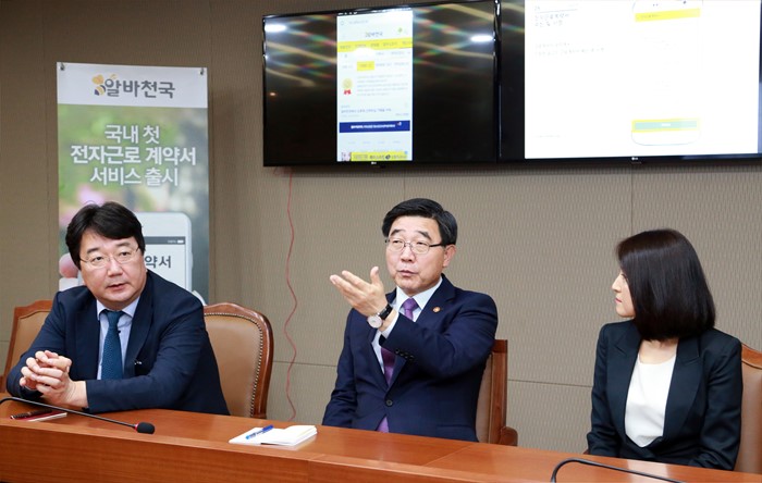 (t서울=포커스뉴스) 이기권 고용노동부 장관이 3일 오후 서울 중구 서울고용노동청에서 전자근로계약서를 선제적으로 도입하는 등 기초고용질서 준수에 적극적으로 노력한 최인녕 알바천국 대표에게 감사패를 수여하고 대화를 나누고 있다. <사진제공=고용노동부>