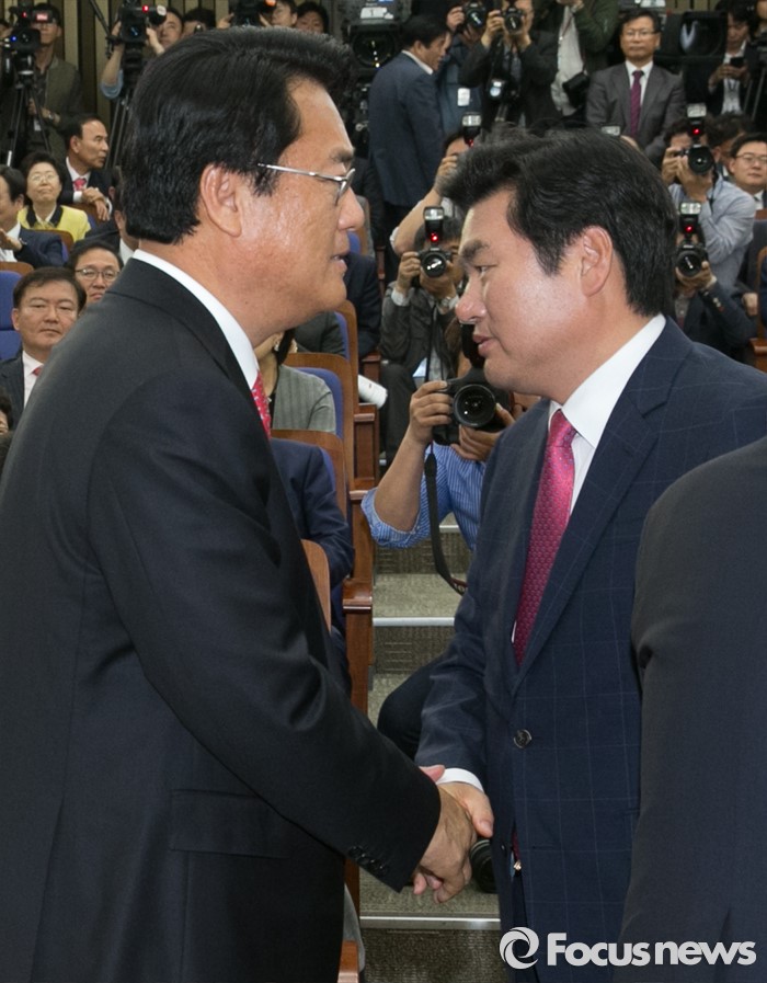 (서울=포커스뉴스) 3일 오후 서울 여의도 국회에서 열린 새누리당 20대 국회 첫 원내대표 및 정책위의장 선출을 위한 당선자 총회에서 선출된 정진석(왼쪽) 신임 원내대표가 원유철 대표최고위원 권한대행으로부터 축하를 받고 있다.