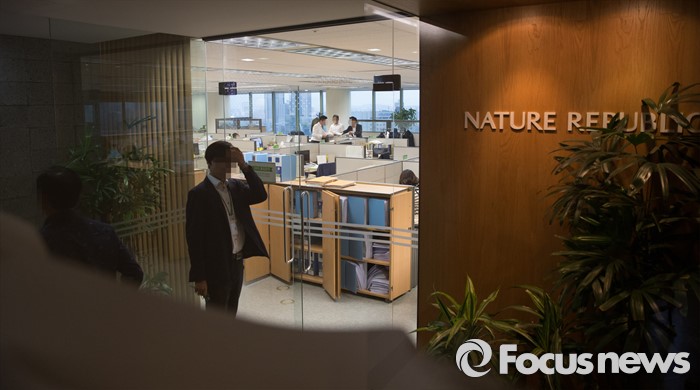 (서울=포커스뉴스) 정운호 네이처리퍼블릭 대표의 전방위 구명로비 의혹과 관련해 검찰이 본사 등을 압수수색하고 있는 3일 오후 서울 강남구 네이처리퍼블릭 본사에서 직원들이 출입문을 신문, 플래카드 등으로 막고 있다.