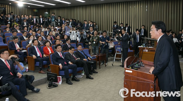 (서울=포커스뉴스) 3일 오후 서울 여의도 국회에서 열린 새누리당 20대 국회 첫 원내대표 및 정책위의장 선출을 위한 당선자 총회에서 선출된 정진석 신임 원내대표가 소감을 전하고 있다.