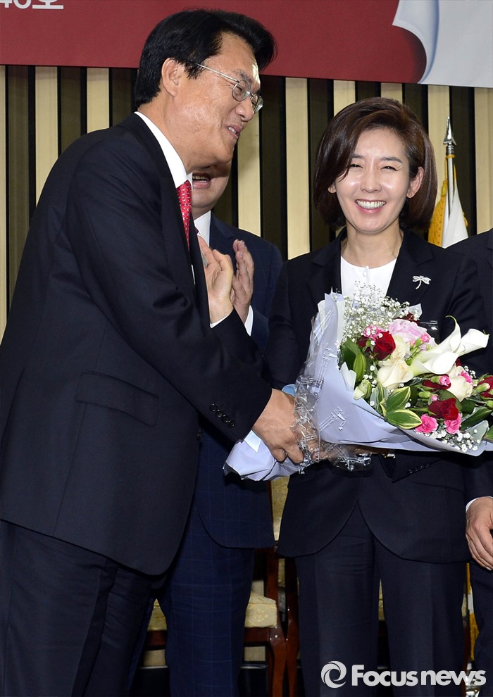 | △ 나경원에게 꽃다발 전하는 정진석 |