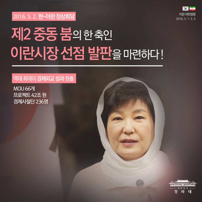 박 대통령은 "밟으면 밟을수록 선명한 색을 드러내는 페르시아의 명품 카펫처럼 양국 국민들은 역경을 더 힘차게 도약해왔다. 세계 경제 불황이 지속되고 있지만 양국 기업이 저력을 발휘해 새로운 도약을 만들어가자"며 축사를 마쳤다.
