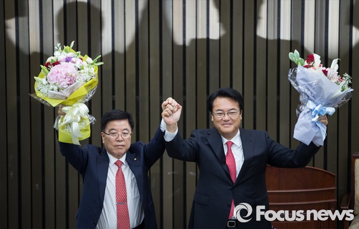 (서울=포커스뉴스) 3일 오후 서울 여의도 국회에서 열린 새누리당 20대 국회 첫 원내대표 및 정책위의장 선출을 위한 당선자 총회에서 선출된 정진석(오른쪽) 신임 원내대표와 김광림 신임 정책위의장이 취재진을 향해 포즈를 취하고 있다.