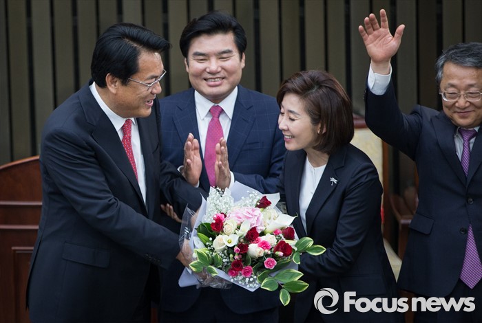 (서울=포커스뉴스) 3일 오후 서울 여의도 국회에서 열린 새누리당 20대 국회 첫 원내대표 및 정책위의장 선출을 위한 당선자 총회에서 원내대표로 선출된 정진석(왼쪽) 신임 원내대표가 경쟁자였던 나경원 후보에게 꽃다발을 전하고 있다.