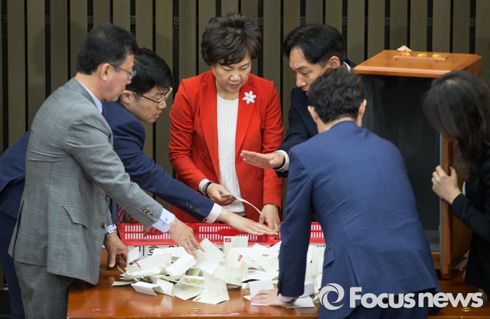 (서울=포커스뉴스) 3일 오후 서울 여의도 국회에서 열린 새누리당 20대 국회 첫 원내대표 및 정책위의장 선출을 위한 당선자 총회에서 당직자들이 투표함을 열고 있다.