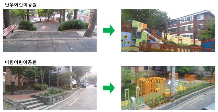 시는 2014년 6월부터 지난해 10월까지 총 59억7200만원(특별교부금 50억2200만원, 민간 9억5000만원)을 투입해 9개 자치구에 29곳의 놀이터를 재조성했다.