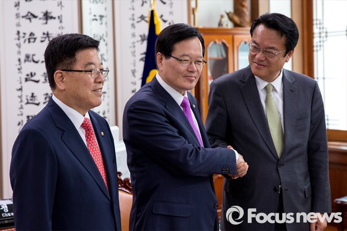 (서울=포커스뉴스) 정의화(가운데) 국회의장이 4일 오전 서울 여의도 국회에서 정진석(오른쪽) 새누리당 신임 원내대표와 김광림 새누리당 신임 정책위원장과 면담에 앞서 사진촬영을 하고 있다.