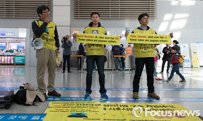 (인천공항=포커스뉴스) 4일 오전 인천국제공항 출국장에서 가습기 살균제 피해자 가족 모임과 환경보건시민센터 관계자들이 옥시레킷벤키저 영국 본사에 항의하기 위해 출국하기 전 기자회견을 하고 있다. 이들은 영국 런던에서 열리는 옥시레킷벤키저의 연례주주총회를 방문할 예정이다.