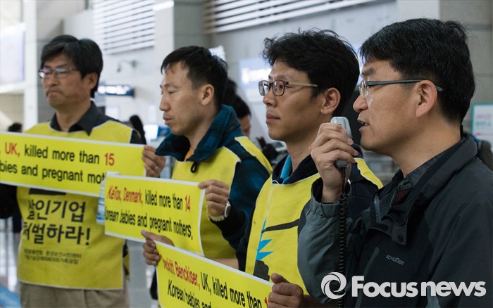 (인천공항=포커스뉴스) 4일 오전 인천국제공항 출국장에서 가습기 살균제 피해자 가족 모임과 환경보건시민센터 관계자들이 옥시레킷벤키저 영국 본사에 항의하기 위해 출국하기 전 기자회견을 하고 있다. 이들은 영국 런던에서 열리는 옥시레킷벤키저의 연례주주총회를 방문할 예정이다.