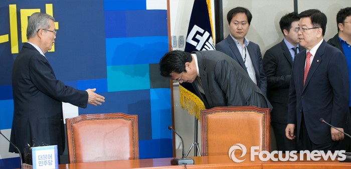 (서울=포커스뉴스) 정진석(앞줄 가운데) 새누리당 신임 원내대표와 김광림(앞줄 오른쪽) 신임 정책위의장이 4일 오전 서울 여의도 국회에서 김종인(왼쪽) 더불어민주당 대표를 예방해, 인사하고 있다.