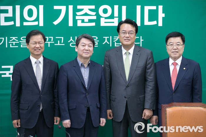 (서울=포커스뉴스) 새누리당 신임 원내지도부가 4일 오전 서울 여의도 국회에서 국민의당 지도부를 예방, 취재진을 향해 포즈를 취하고 있다. 오른쪽부터 김광림 새누리당 신임 정책위의장, 정진석 신임 원내대표, 안철수 국민의당 상임공동대표, 천정배 공동대표.