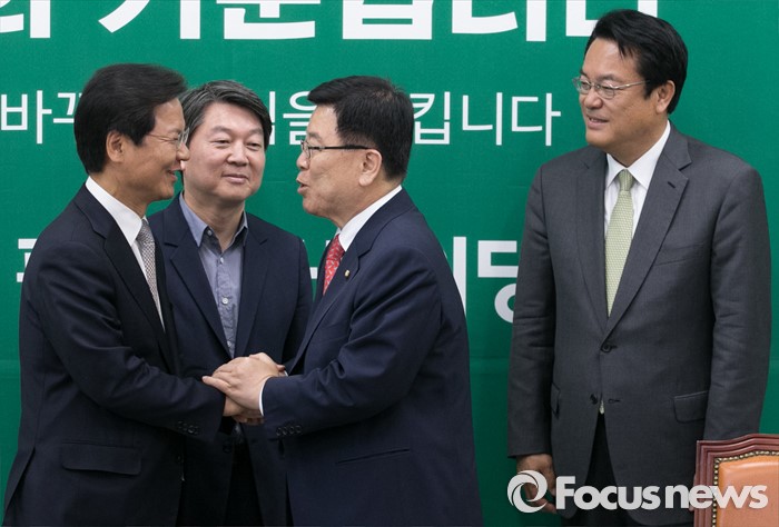 (서울=포커스뉴스) 새누리당 신임 원내지도부가 4일 오전 서울 여의도 국회에서 국민의당 지도부를 예방, 인사하고 있다. 오른쪽부터 정진석 새누리당 신임 원내대표, 김광림 신임 정책위의장, 안철수 국민의당 상임공동대표, 천정배 공동대표.