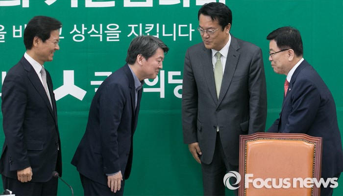 (서울=포커스뉴스) 새누리당 신임 원내지도부가 4일 오전 서울 여의도 국회에서 국민의당 지도부를 예방, 인사하고 있다. 오른쪽부터 김광림 새누리당 신임 정책위의장, 정진석 신임 원내대표, 안철수 국민의당 상임공동대표, 천정배 공동대표.