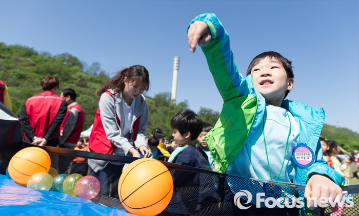 (서울=포커스뉴스) 어린이날을 하루 앞둔 4일 오전 서울 마포구 월드컵공원 난지잔디광장에서 2016 마포어린이축제에 참가한 어린이들이 공을 던지고 있다.