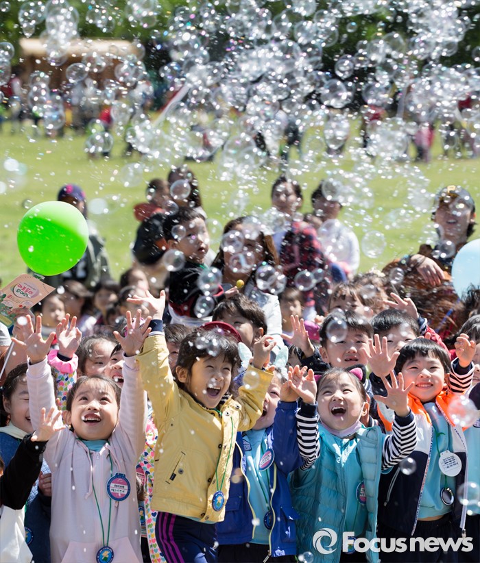(서울=포커스뉴스) 어린이날을 하루 앞둔 4일 오전 서울 마포구 월드컵공원 난지잔디광장에서 2016 마포어린이축제에 참가한 어린이들이 버블쇼를 보며 즐거운 시간을 보내고 있다.