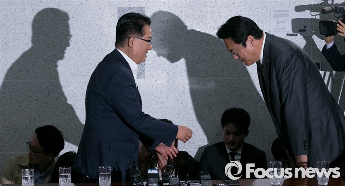 (서울=포커스뉴스) 정진석(오른쪽) 새누리당 신임 원내대표가 4일 오전 서울 여의도 국회 의원회관에서 박지원 국민의당 원내대표를 예방, 인사하고 있다.