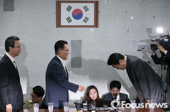 (서울=포커스뉴스) 정진석(오른쪽) 새누리당 신임 원내대표가 4일 오전 서울 여의도 국회 의원회관에서 박지원(가운데) 국민의당 원내대표, 김성식 정책위의장을 예방, 인사하고 있다.