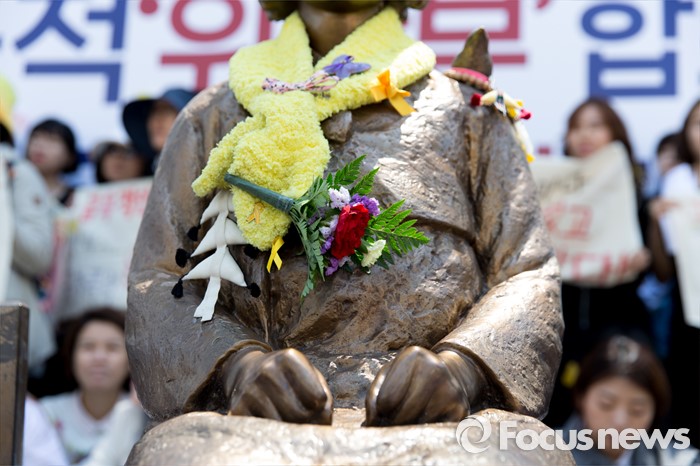 (서울=포커스뉴스) 4일 오후 서울 종로구 옛 일본대사관 앞에서 열린 제1229차 일본군 위안부 문제해결을 위한 정기 수요집회에서 소녀상에 카네이션이 달려있다.
