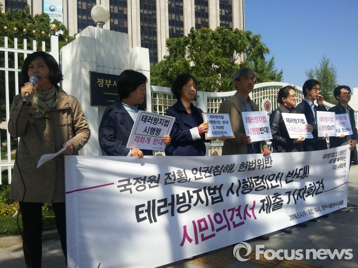 진보네트워크센터, 참여연대 등 49개 시민·사회단체연합은 4일 오전 서울 종로구 정부서울청사 앞에서 기자회견을 열고 "야당의 테러방지법 반대 필리버스터 이후 많은 국민이 국정원의 권한이 확대되는 것에 우려하고 있다"며 "테러방지법 시행에 반대하는 시민들의 의견서를 모아 전달한다"고 밝혔다.
