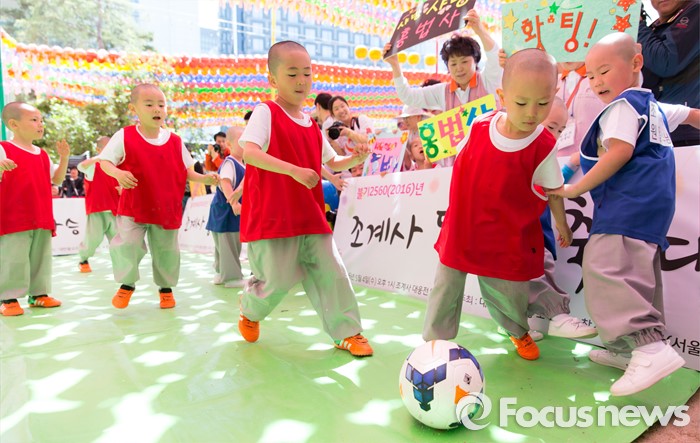 (서울=포커스뉴스) 4일 오후 서울 종로구 조계사 대웅전 앞에서 조계사와 홍법사 동자스님들이 축구대회에 참가해 실력을 겨루고 있다.