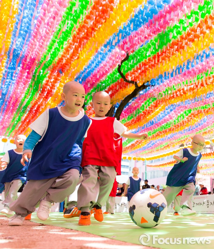 (서울=포커스뉴스) 4일 오후 서울 종로구 조계사 대웅전 앞에서 조계사와 홍법사 동자스님들이 축구대회에 참가해 실력을 겨루고 있다.