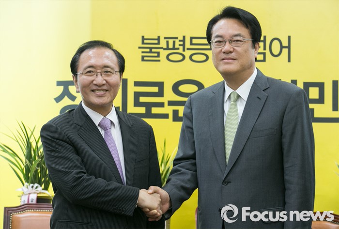 (서울=포커스뉴스) 정진석(오른쪽) 새누리당 신임 원내대표가 4일 오후 서울 여의도 국회에서 노회찬 정의당 원내대표를 예방, 취재진을 향해 포즈를 취하고 있다.