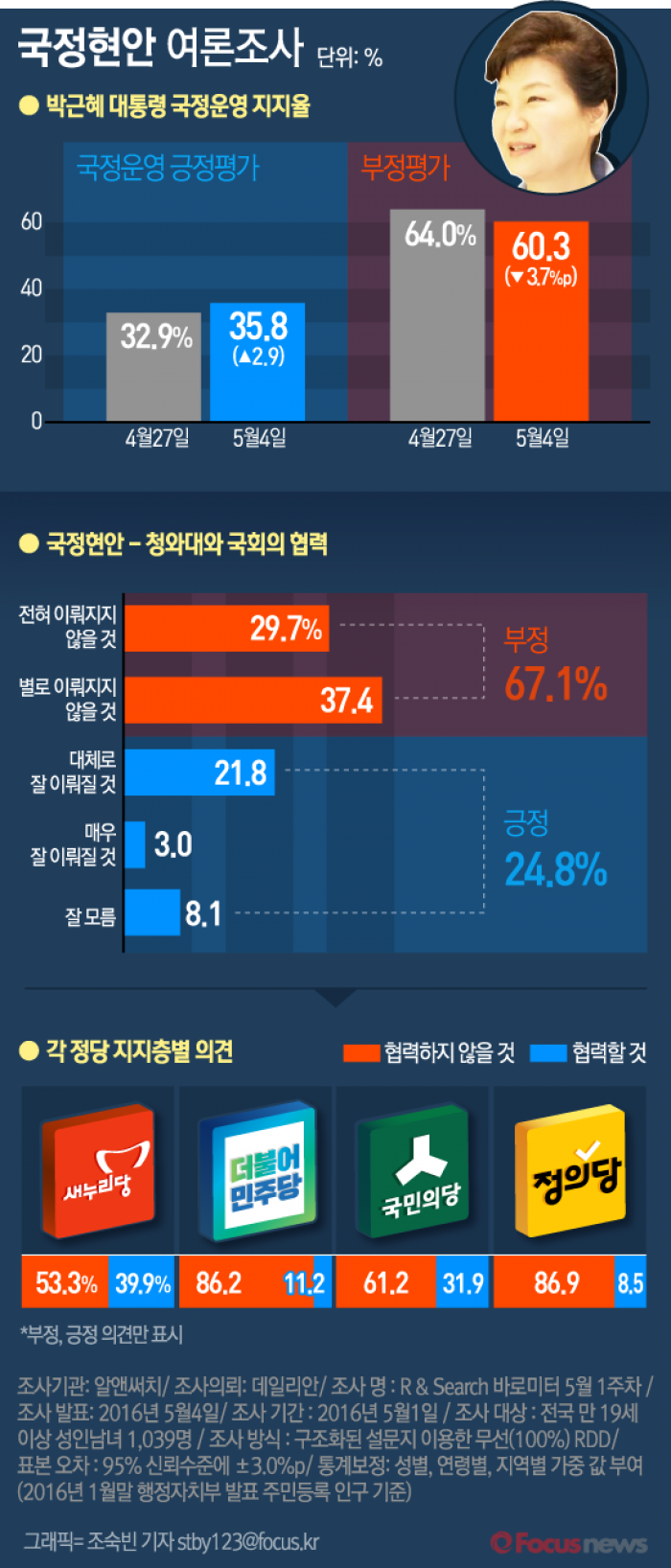 (서울=포커스뉴스) 데일리안이 의뢰해 여론조사기관인 알앤써치가 조사, 4일 발표한 자료에 따르면 향후 청와대와 국회의 협력에 대해 부정적이라고 답한 응답자들이 전체의 67.1%를 차지했다. 협력이 가능할 것이라고 답한 긍정적인 응답률은 24.8%를 차지했다.